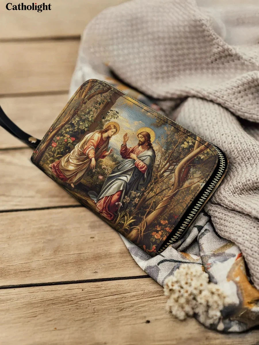 Christ, dressed in radiant robes, extends a gesture of reassurance and peace, while Mary kneels in awe and devotion, her expression reflecting reverence and love. The intricate artistry and vibrant details convey the message of renewal, hope, and divine grace, making this wallet a meaningful representation of faith and redemption.
