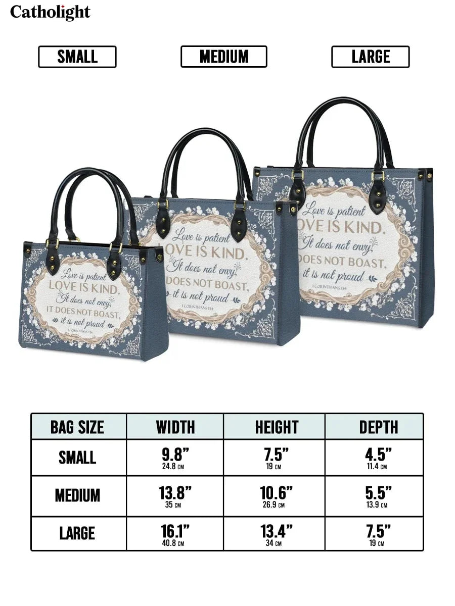 The bag beautifully celebrates the enduring message of love and virtue from 1 Corinthians 13:4. Adorned with the heartfelt words "Love is patient, Love is kind," encased in a delicate floral frame and ornate design, this bag radiates grace, faith, and timeless beauty. Its harmonious color scheme adds a touch of elegance, making it both meaningful and fashionable.