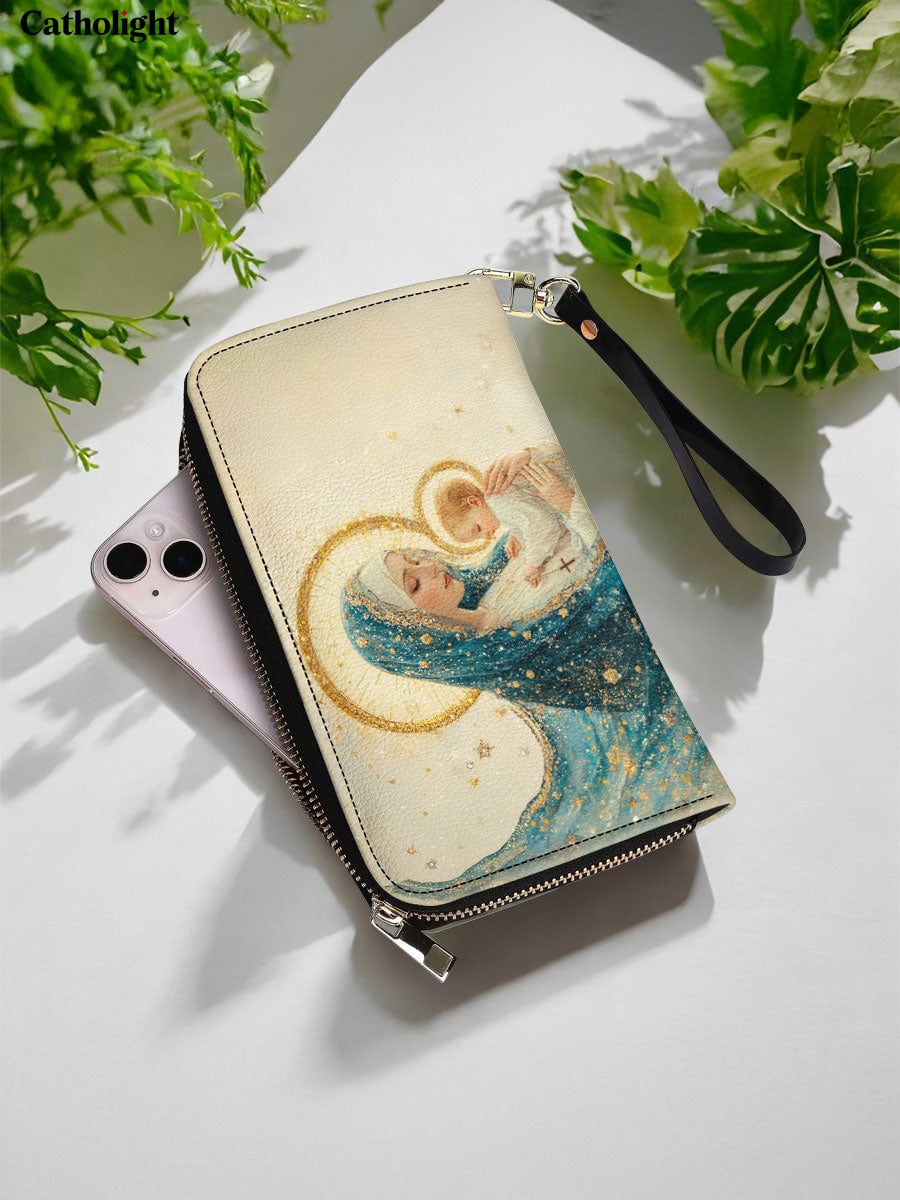 This exquisite wallet features a radiant image of the Blessed Virgin Mary and the Christ Child, surrounded by a heavenly glow of gold and deep celestial blue. The stars adorning Mary’s veil and the delicate halos symbolize her divine purity, grace, and the enduring bond between mother and child. The artwork exudes serenity and devotion, making it a meaningful expression of faith.