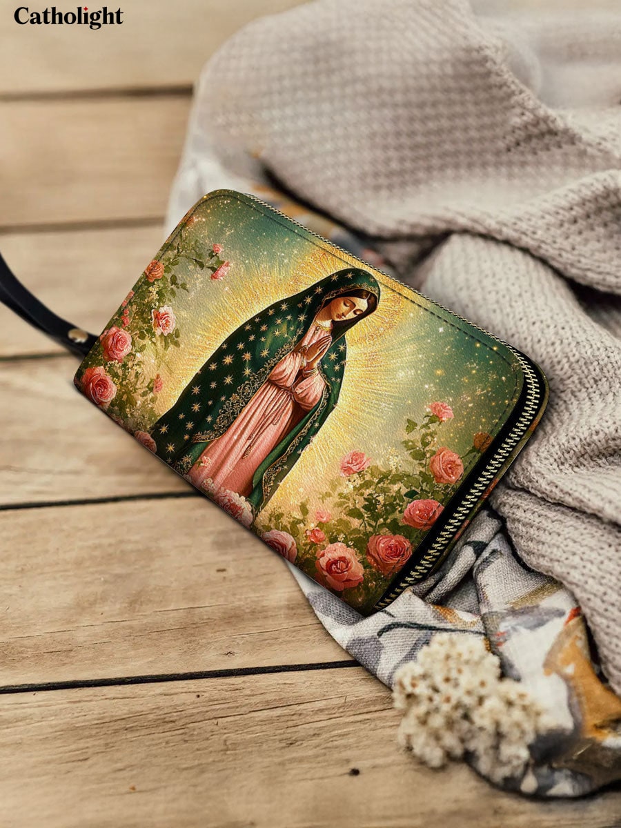 This beautifully crafted wallet showcases a graceful image of Our Lady of Guadalupe, bathed in golden light and surrounded by blooming pink roses. Her emerald green mantle, adorned with shining stars, and her gentle expression reflect divine love, compassion, and serenity. The vibrant floral accents symbolize the miraculous roses of her apparition, adding spiritual depth and elegance to the design.