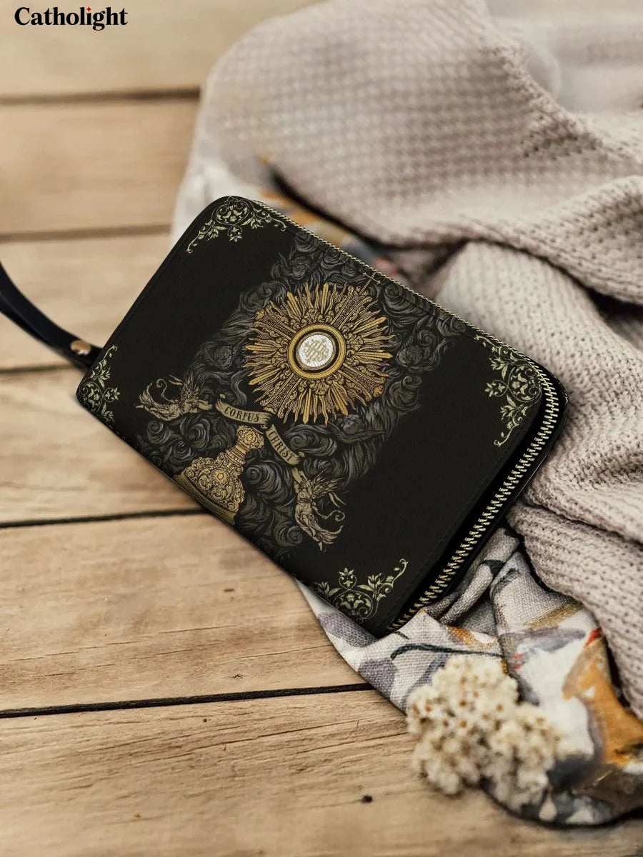 This wallet showcases a breathtaking depiction of the Corpus Christi monstrance, intricately designed with golden accents and surrounded by delicate angelic figures in reverent worship. The central Eucharist, marked with the sacred IHS symbol, radiates divine light against a dramatic black background adorned with ornate golden flourishes, evoking a sense of sacred majesty.