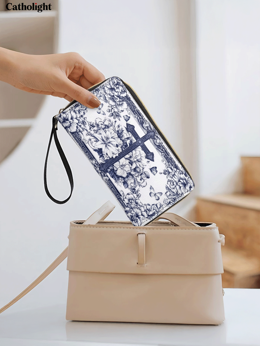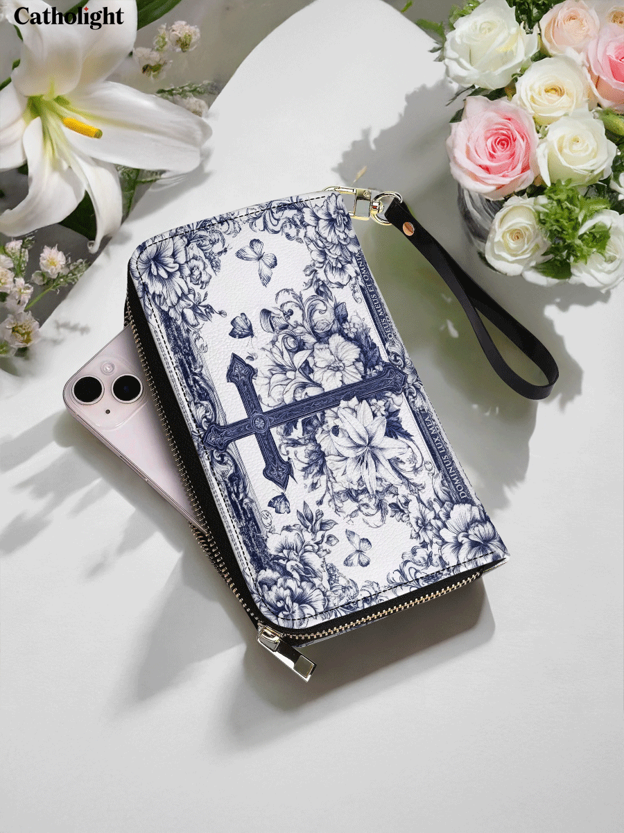 Celebrate the harmony of faith and nature with this beautifully crafted leather wallet purse. Featuring a delicately drawn cross at its heart, surrounded by an intricate tapestry of blooming flowers, this design symbolizes growth, purity, and the unwavering strength of belief. Rendered in an elegant blue-and-white palette, the artwork evokes a timeless charm and sophistication.