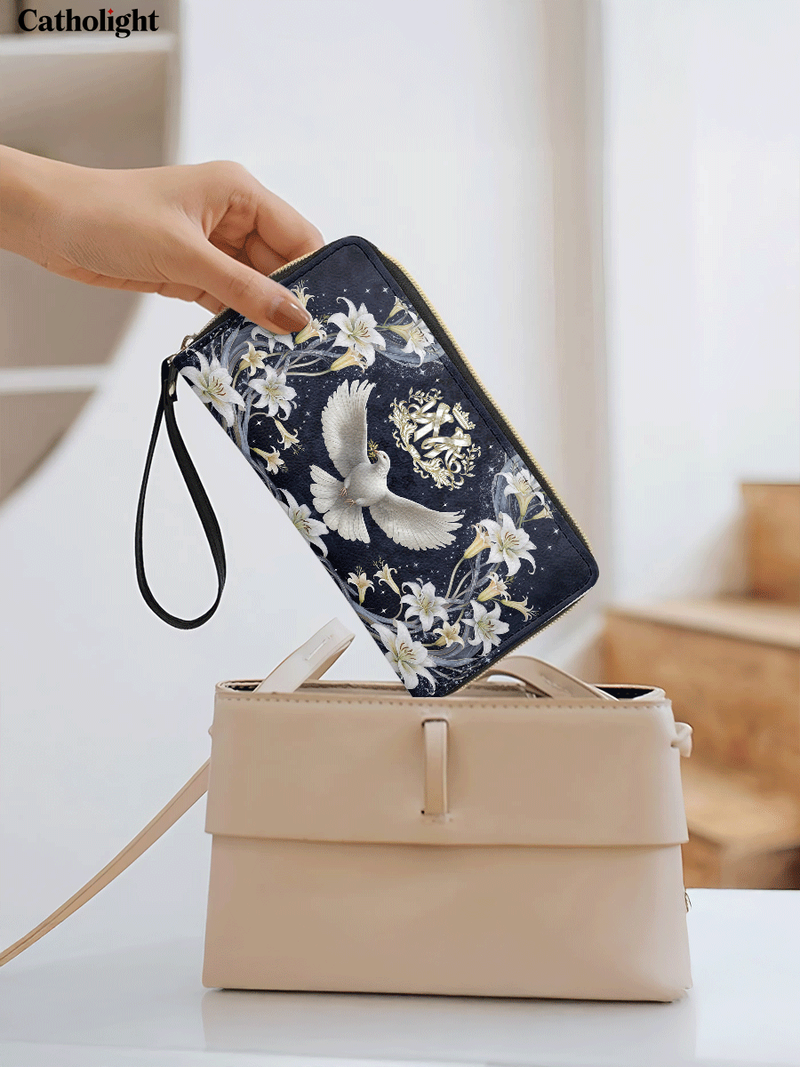 Crafted from high-quality leather, this wallet is as functional as it is beautiful, featuring multiple compartments for effortless organization. The lilies, often associated with faith and renewal, perfectly complement the dove's representation of the Holy Spirit, making this wallet a powerful emblem of hope and sacred devotion.