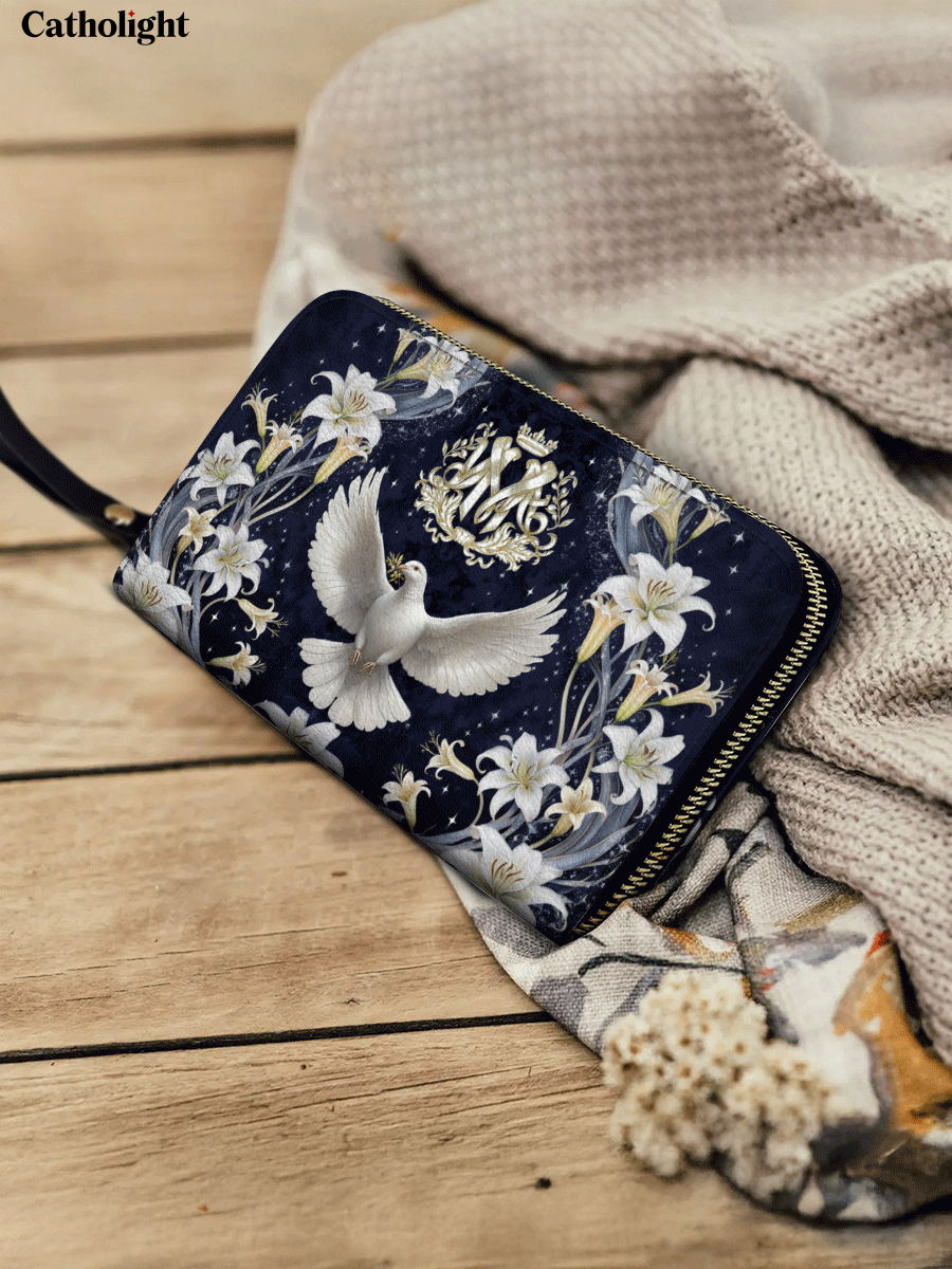 Gracefully adorned with the symbol of the Holy Spirit in the form of a radiant dove surrounded by delicate lilies, The Holy Spirit and Lily Devotional Leather Wallet Purse exudes purity, peace, and divine inspiration. The deep navy backdrop enhances the golden emblem and pristine floral details, creating a harmonious balance between elegance and spirituality.