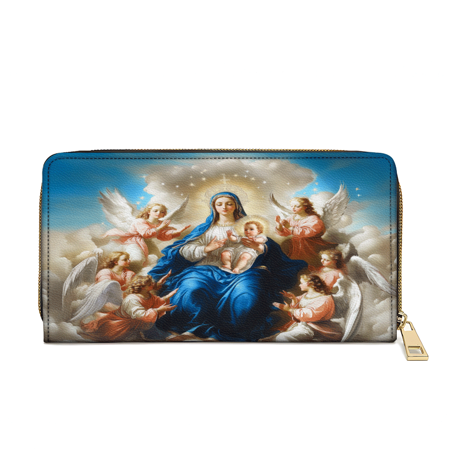 This exquisite Catholight Leather Wallet Purse is a stunning blend of faith and fashion, featuring a beautifully detailed depiction of the Virgin Mary holding baby Jesus, surrounded by adoring angels. With a heavenly glow radiating from the artwork, the Leather Wallet Purse exudes divinity, making it a perfect statement piece for those who cherish their Catholic faith and love elegant, artistic accessories.