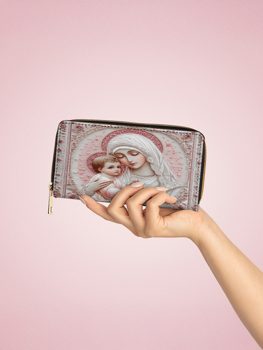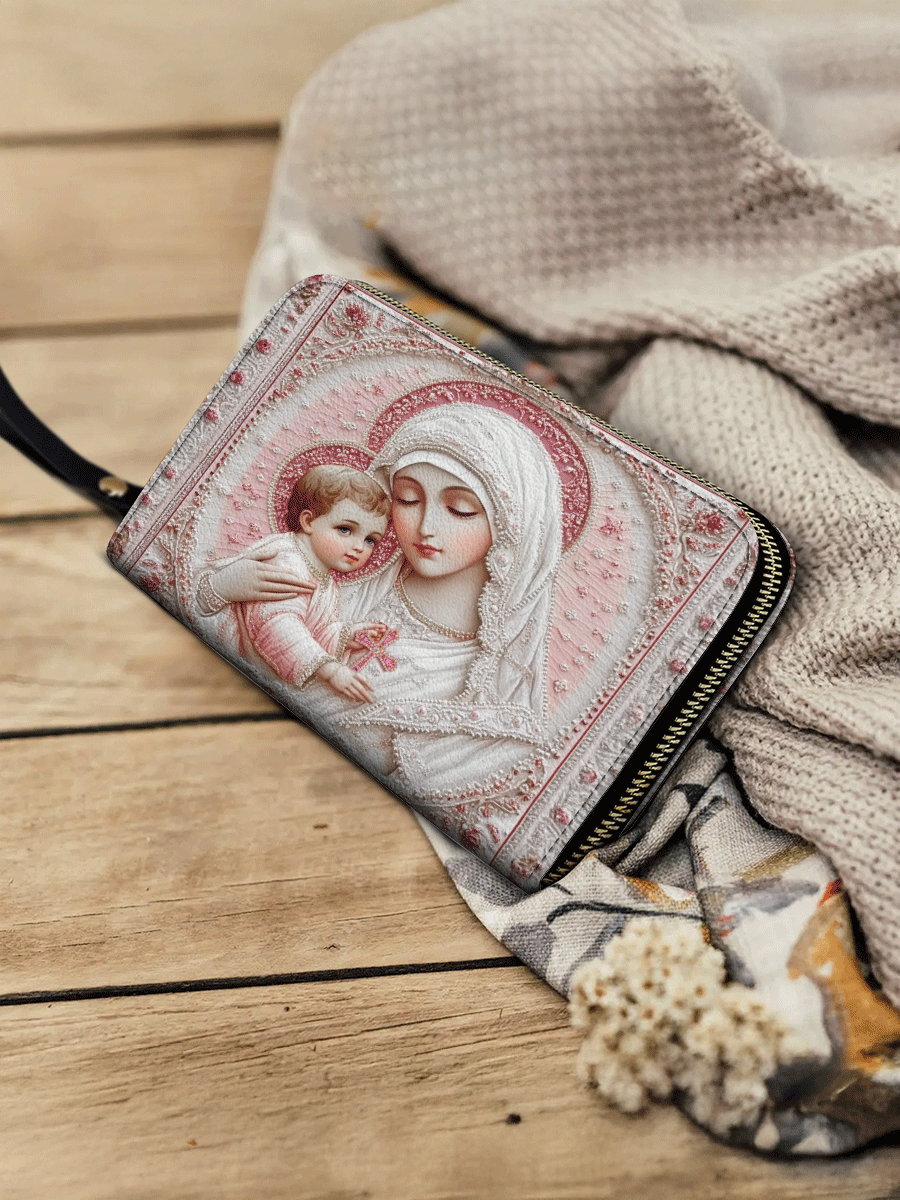 This is a masterpiece of faith and elegance, featuring an exquisite depiction of the Virgin Mary cradling Baby Jesus in a moment of divine love and devotion. Wrapped in soft hues of ivory and blush pink, this design radiates serenity, warmth, and grace. Intricate details and ornate textures enhance the ethereal beauty, making this wallet a perfect blend of spirituality and timeless luxury.
