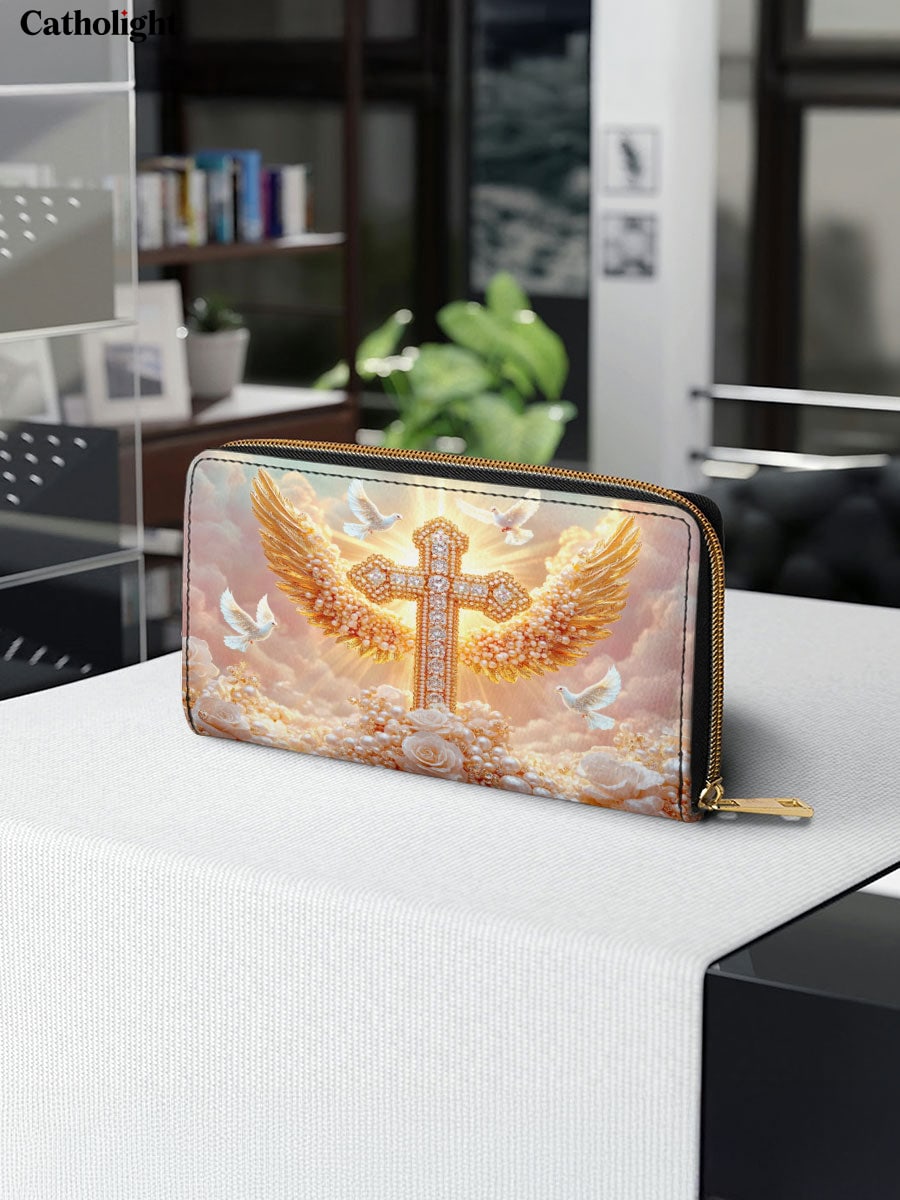 This beautifully crafted wallet showcases a glowing jeweled cross with golden wings, surrounded by soft white roses and soaring doves. The intricate design, with pearls and radiant details, symbolizes divine grace, faith, and peace. The pastel tones and angelic imagery create a sense of serenity, making this wallet a heartfelt expression of devotion.
