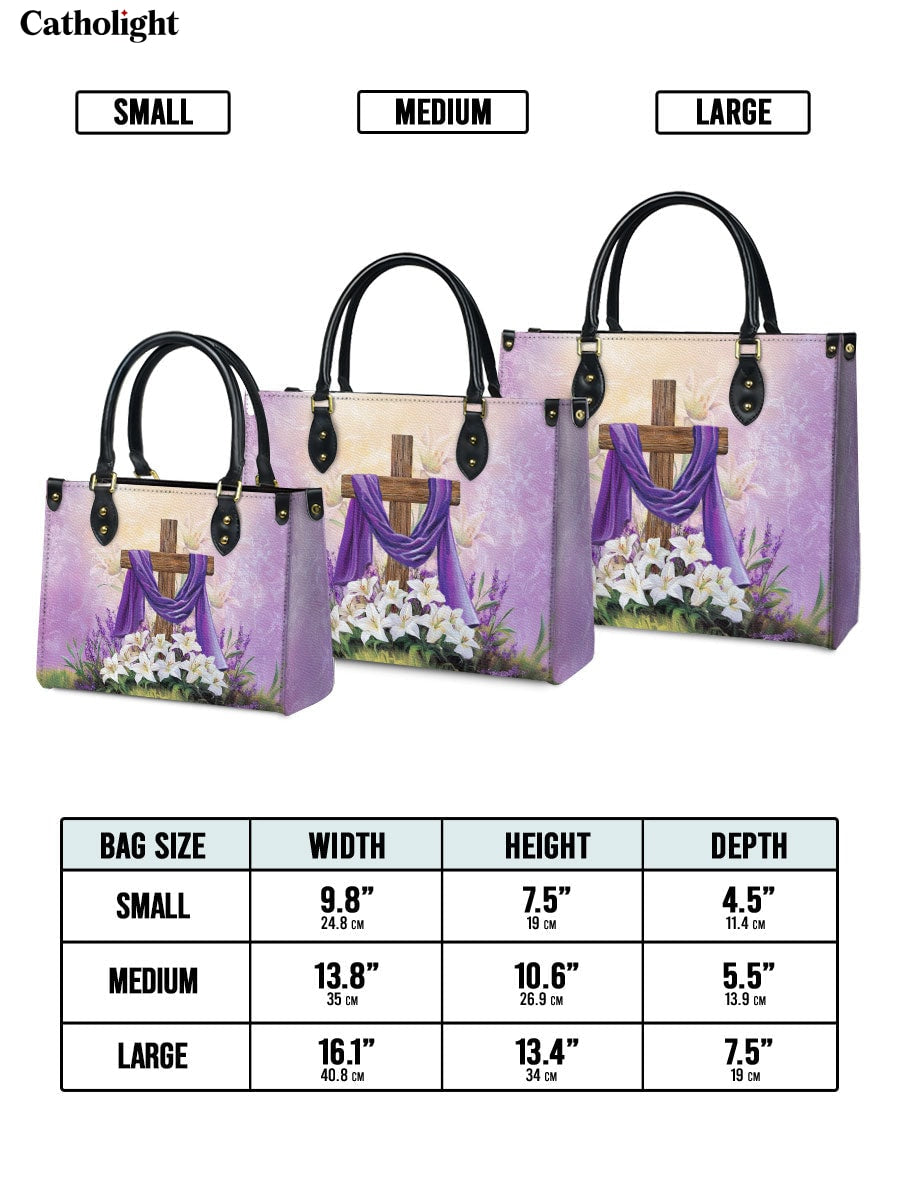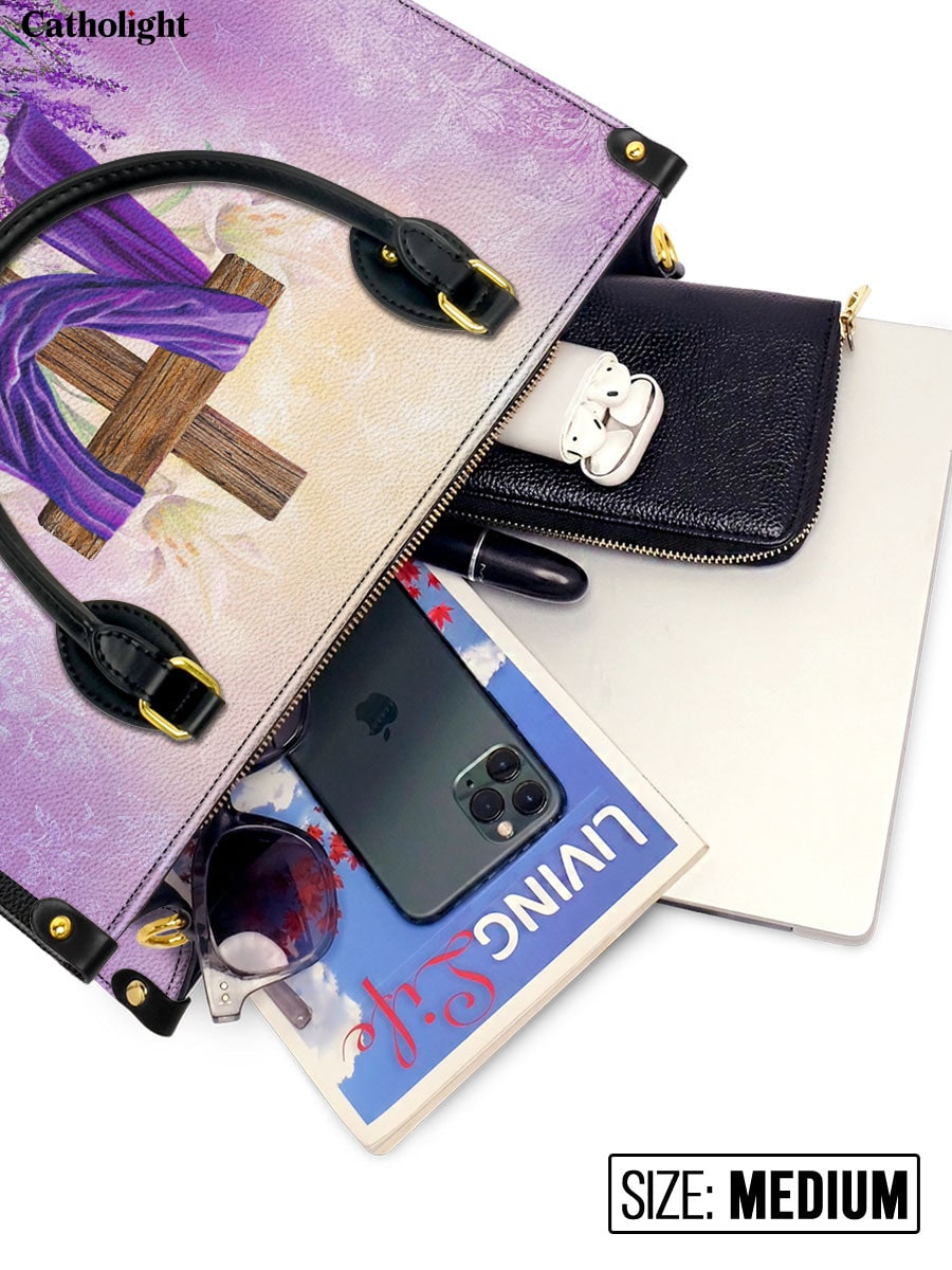 This elegant leather bag features a beautiful depiction of the Cross, adorned with a flowing purple cloth symbolizing Lent and Easter's sacred promise of redemption. Surrounding the Cross are white lilies, representing purity and resurrection, and lavender flowers, evoking peace and devotion. The soft purple background adds a serene touch, creating a timeless expression of faith and hope. Crafted with care, this bag is both a meaningful accessory and a daily reminder of Christ’s love and sacrifice.