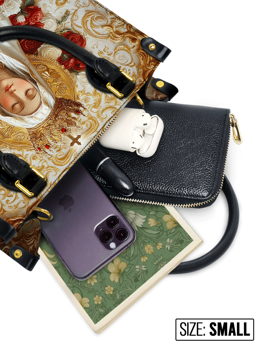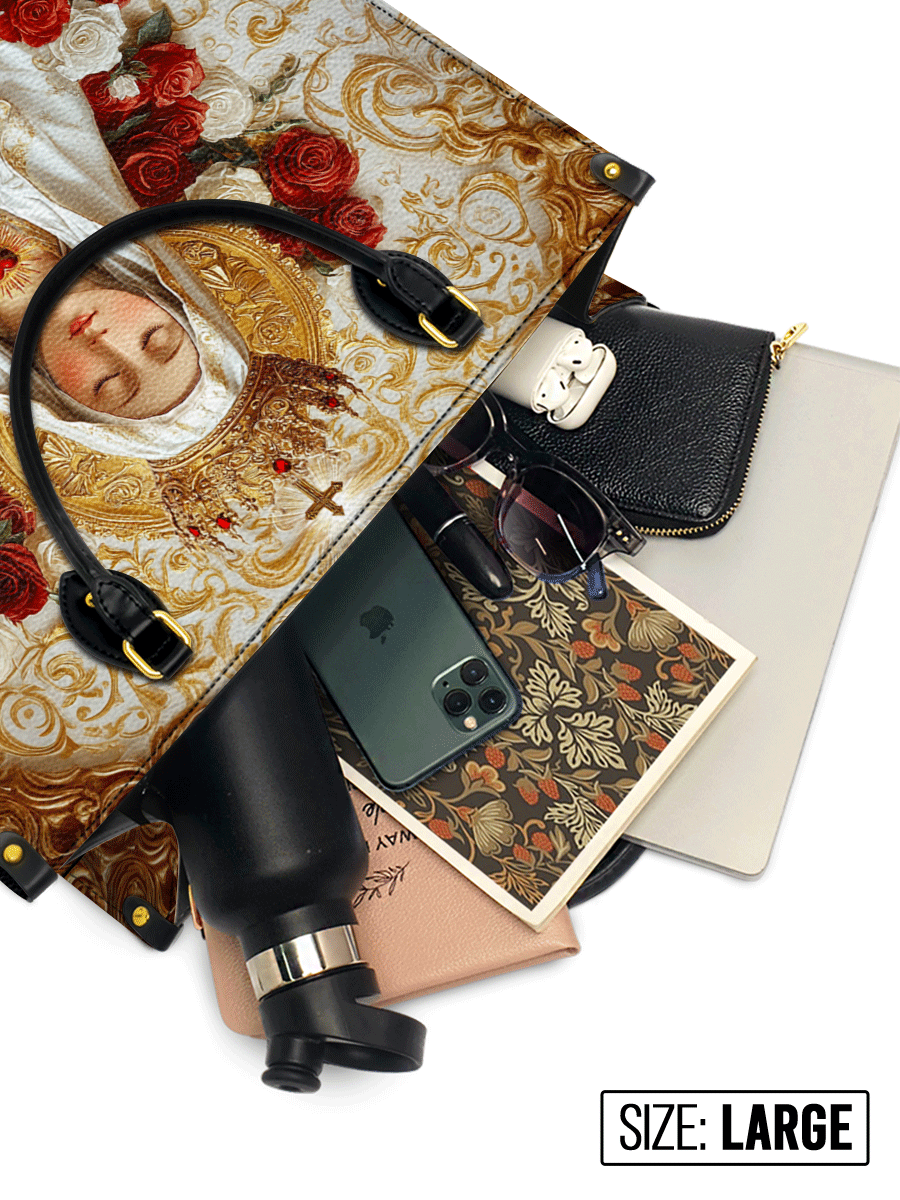 The Lady of Fatima Elegance Leather Bag is a stunning fusion of faith and luxury, featuring a breathtaking Renaissance-Baroque depiction of Our Lady of Fatima in prayer. She is adorned in a flowing white robe with golden embroidery, crowned in regal splendor, and encircled by vibrant red and white roses, symbolizing love, purity, and divine grace. The ornate golden background adds a touch of sacred opulence, evoking the grandeur of classic religious art.