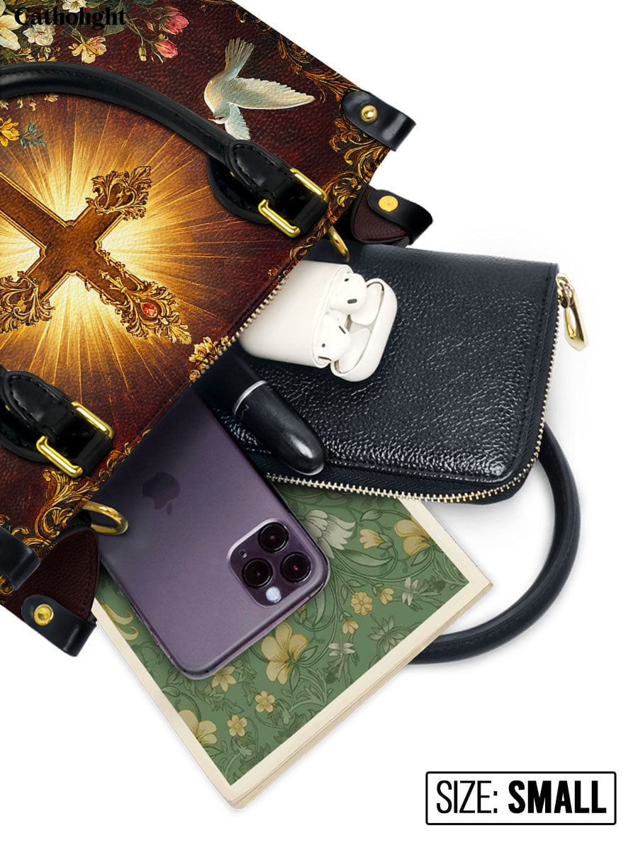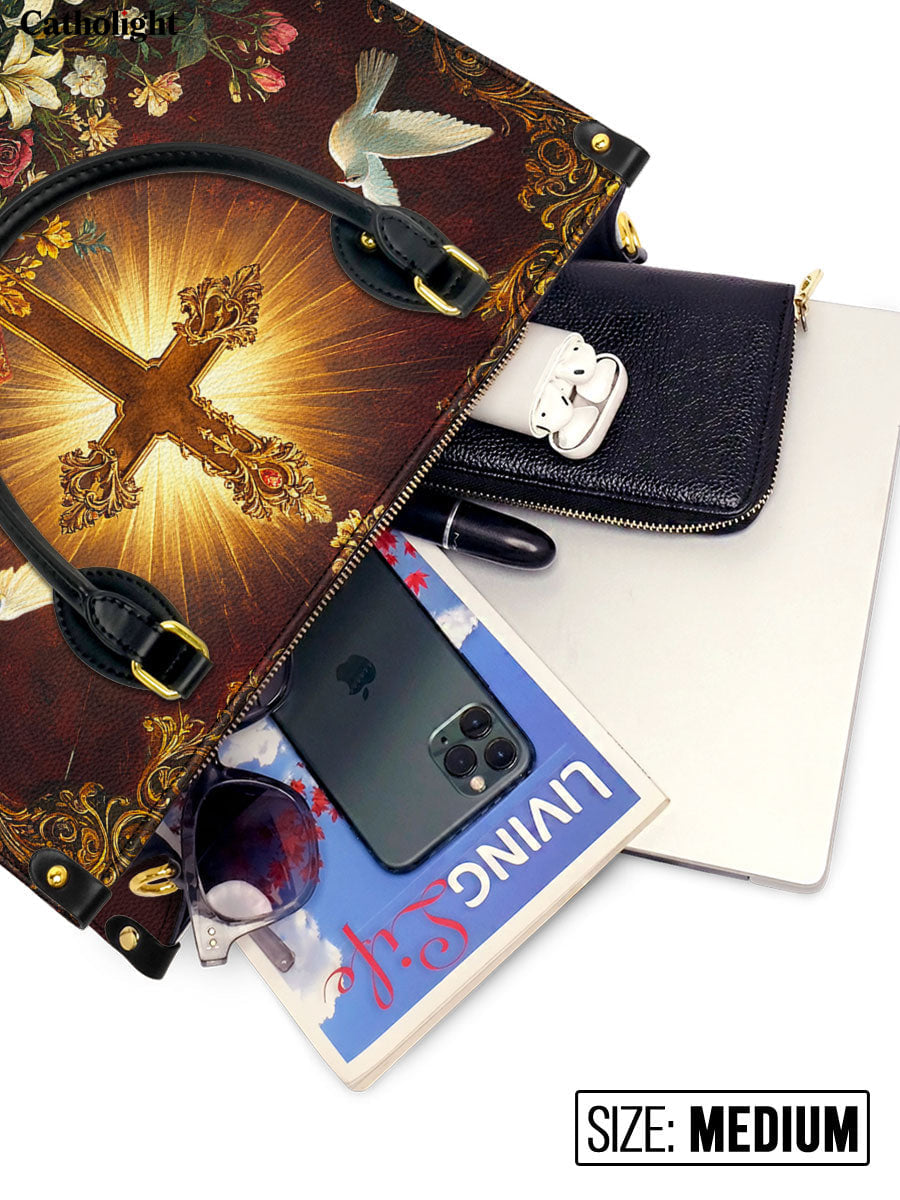 This magnificent leather bag features a radiant depiction of the Holy Cross, illuminated by heavenly light and surrounded by a vibrant arrangement of roses, lilies, and delicate floral accents. Two doves gracefully hover near the Cross, symbolizing peace and the presence of the Holy Spirit. The golden glow behind the Cross emphasizes its sacred significance as a symbol of redemption, hope, and eternal life. The intricate design, rich colors, and thoughtful details evoke a sense of reverence and devotion, creating a timeless tribute to faith.