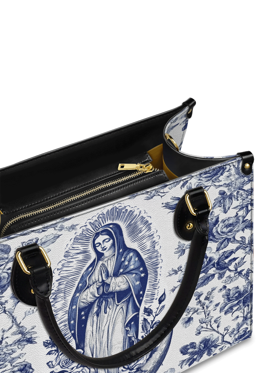 The Sacred Serenity Virgin Mary Leather Bag is a beautifully designed handbag that combines faith, elegance, and artistry. Made from premium leather, this tote features a classic blue-and-white toile pattern adorned with a graceful depiction of the Virgin Mary, symbolizing peace and devotion. The structured silhouette, accented with gold-tone hardware and black leather handles, adds a touch of sophistication. Designed for both style and functionality, this bag is perfect for those who want to carry their faith with them in a refined and fashionable way.
