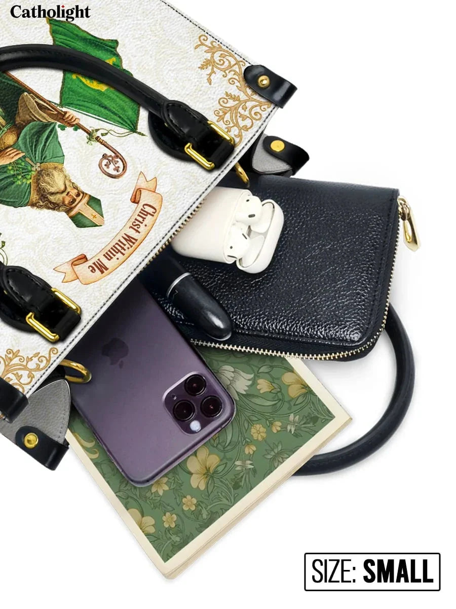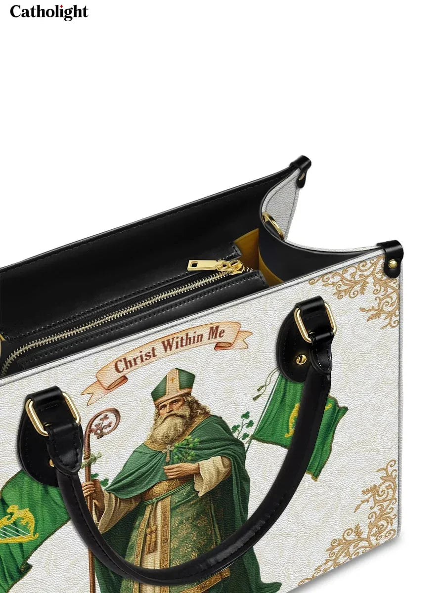 The "Saint Patrick's Devotion" leather bag beautifully captures the essence of Saint Patrick, the beloved patron saint of Ireland. At its center is a majestic illustration of Saint Patrick in his iconic green vestments, holding a shamrock and his bishop's crozier, representing his role as a teacher of the Holy Trinity. The backdrop features emerald green flags adorned with golden harps, a tribute to Irish tradition, while intricate gold patterns add an elegant touch. The serpent at his feet symbolizes his legendary act of banishing snakes from Ireland, a powerful metaphor for triumph over sin and adversity.