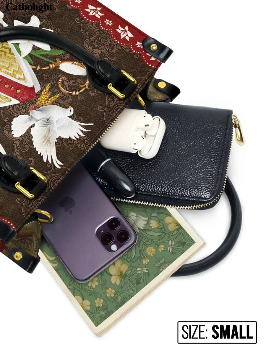 This leather bag showcases an elegant and symbolic design, featuring a beautifully detailed bishop's mitre surrounded by blooming white lilies, signifying purity and divine devotion. A radiant dove, representing the Holy Spirit, gracefully rests above the mitre, symbolizing peace, guidance, and spiritual blessings. The intricate golden embroidery and ornate red accents evoke a sense of reverence and majesty, making this bag a stunning tribute to the sacred traditions of faith.