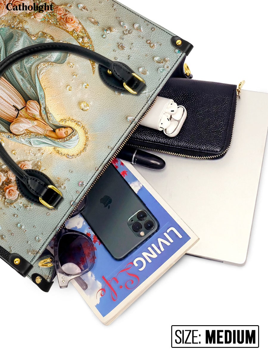 This exquisite leather bag showcases a serene image of the Blessed Virgin Mary standing gracefully on a crescent moon, encircled by delicate roses and soft golden light. The artwork beautifully symbolizes Mary’s purity, humility, and her role as the Queen of Heaven. The intricate details of her flowing veil and the soft pastel hues evoke peace, grace, and divine love, creating a meaningful piece that radiates faith and devotion.