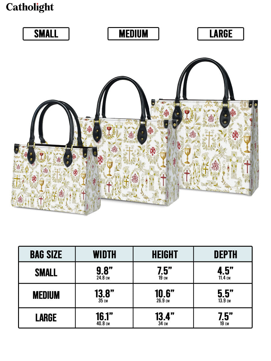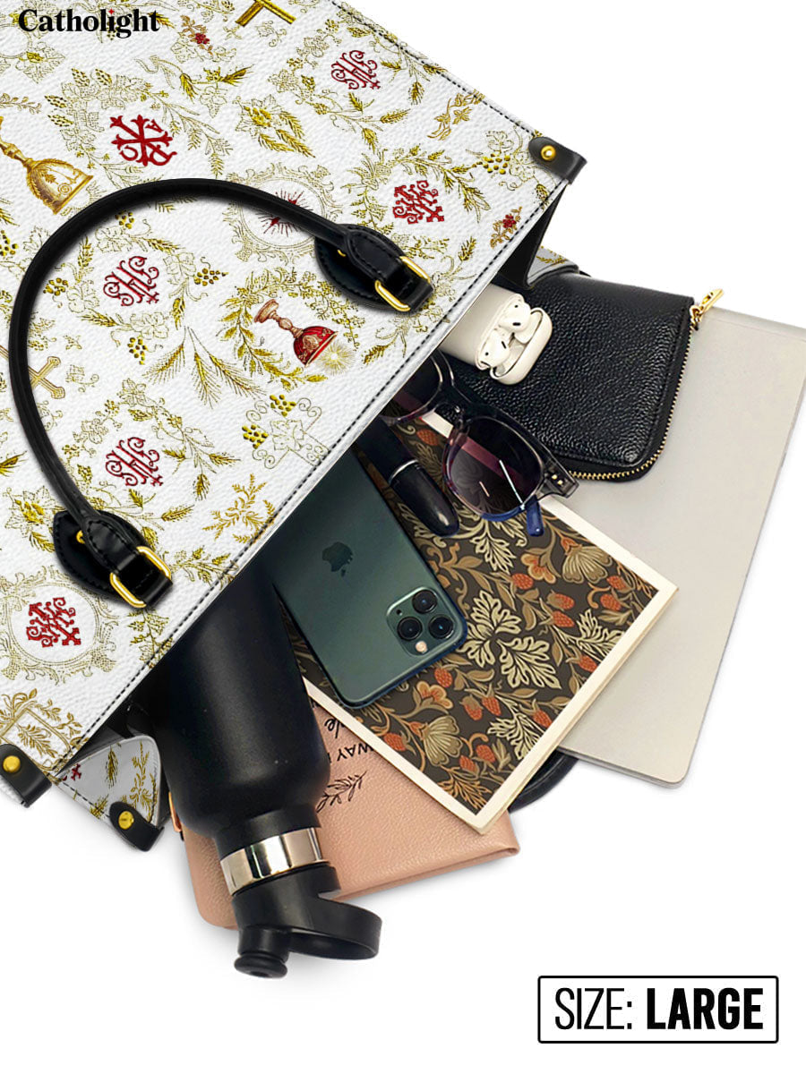 This elegant leather bag features a refined and intricate pattern of sacred Christian symbols, including the cross, chalice, Eucharistic host, and holy monograms. Each emblem is beautifully adorned with golden accents and surrounded by delicate floral and vine motifs, symbolizing the richness and depth of the Catholic faith. The harmonious combination of white, gold, and deep red creates a timeless and reverent design, celebrating the sacred mysteries and the beauty of devotion.
